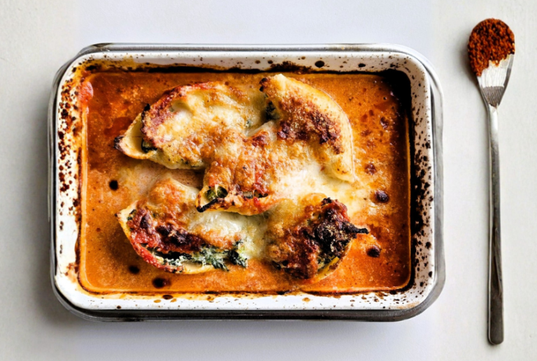 mit Ricotta und Spinat gefüllte Nudelkörbchen, in Tomatensauce mit Mozzarella überbacken