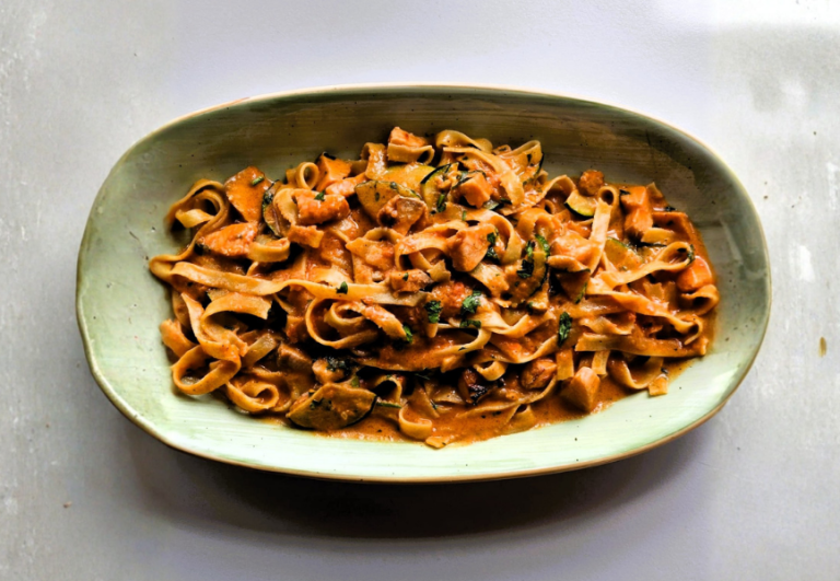 mit Lachsfilet und Zucchini in einer feinen Sauce mit Knoblauch