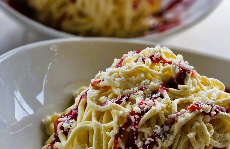 Feines Vanilleeis in Spaghetti-Form mit fruchtiger Erdbeersauce und weißer Schokolade – ein echter Klassiker.