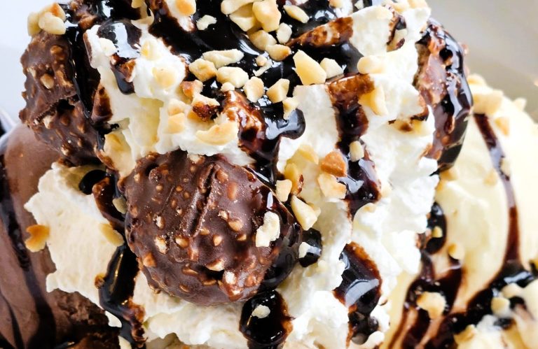 Vanille-, Nuss- und Schokoladeneis mit Sahne, Rocher-Kugeln und Schokosauce – intensiv und cremig.